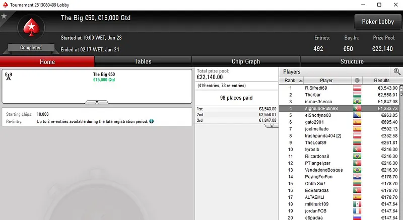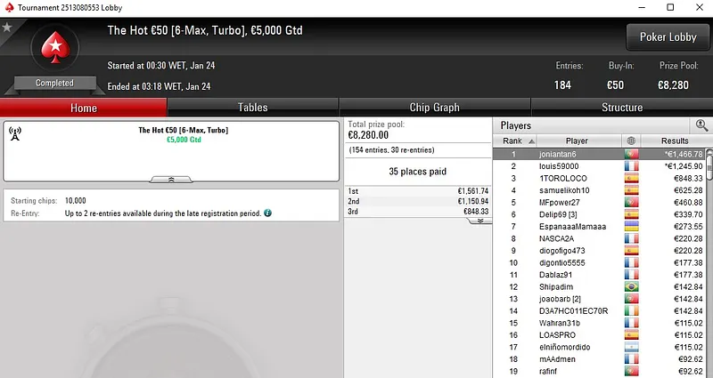 Tiago "tiagoferreir" Ferreira foi 2º classificado no Midnight Express €20, torneio que contou com um field de 1.240 entradas, e em menos de duas horas transformou €20 num prémio de €1.681.