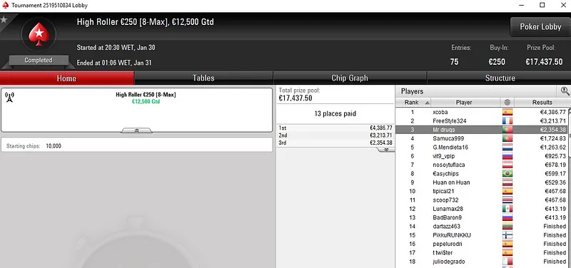 No The Big Special Carnaval Series €10, torneio que registou 1.904 entradas e mais de €17K em prémios, sHrzZ bateu toda a concorrência e teve direito a um prémio de €2.186, mais uma entrada de €250 para o Main Event das Carnaval Series.