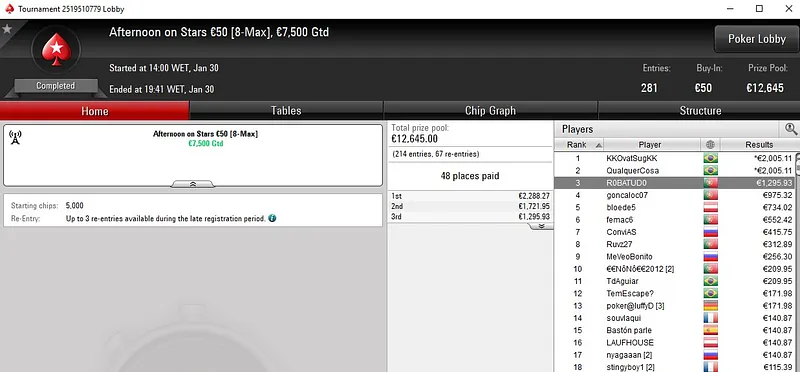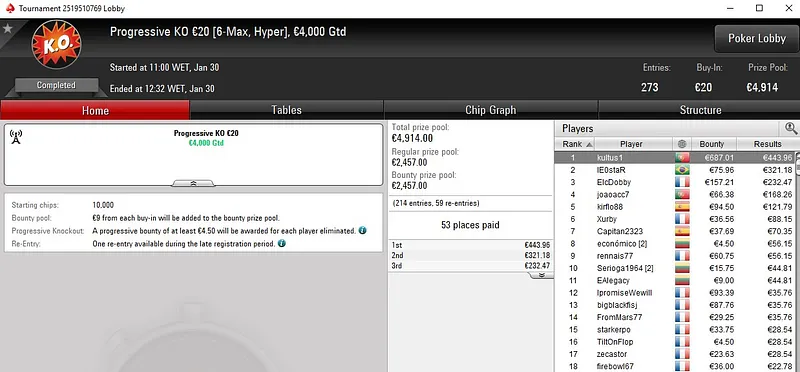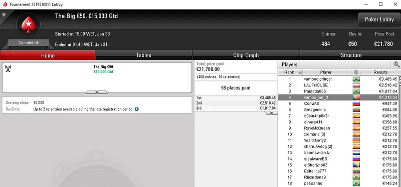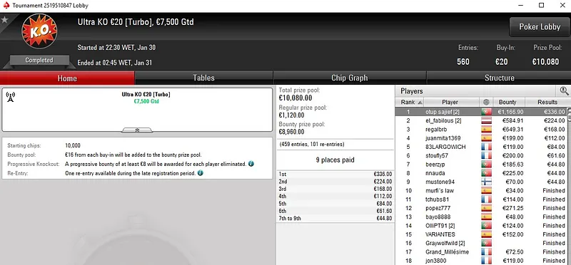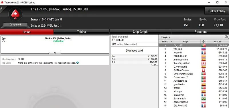 O Midnight Express €20 é um dos torneios mais rápidos da PokerStars e o vencedor tem sempre à sua espera um dos maiores prémios do dia. Na sessão de ontem, o torneio não durou nem duas horas e Portugal conseguiu os dois lugares mais altos do pódio. Tarjek foi o campeão e encaixou um prémio de €3.246, depois de bater Miznizz no heads-up, com este último a receber €2.313.