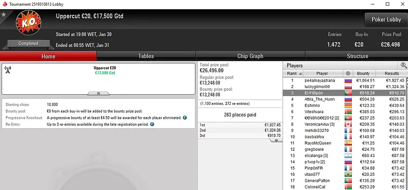 Quem também engordou a banca no grind de quarta-feira foi jpfteixeira9, jogador que foi segundo classificado entre um field de 555 entradas no Progressive KO €50 [6-Max] para um prémio total de €2.790.