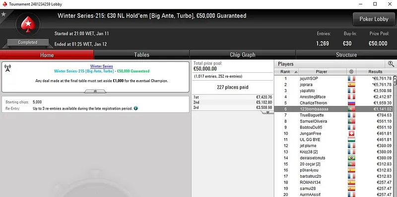 Pedro "jgrhajsj" Cabeça subiu ao lugar mais alto do pódio do Evento #214: €50 NLH [Progressive KO, 6-Max] e encaixou um belo prémio de €9.075. Na mesa final estiveram também os portugueses Hélder "Fellin33" Teixeira, terceiro para €3.147, e "GJRF5" que terminou na quarta posição para €1.882.