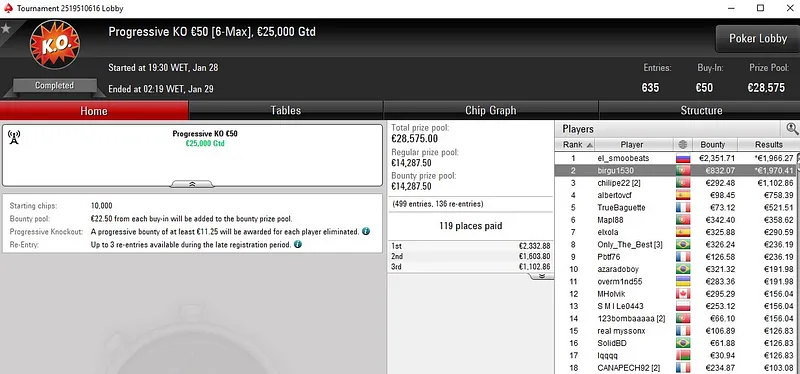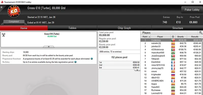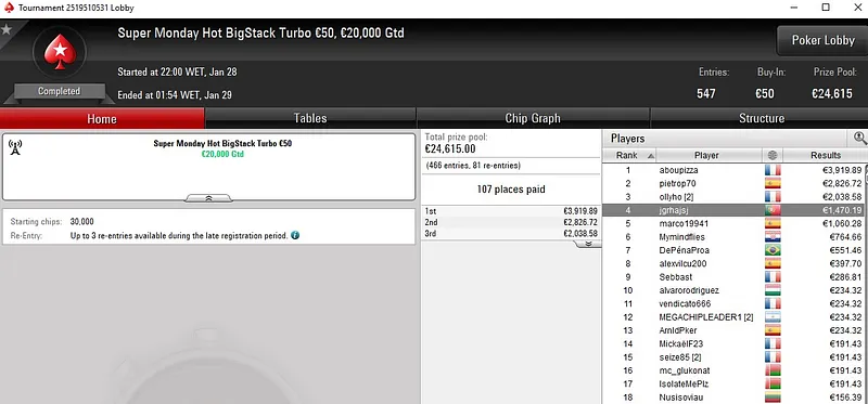 Outro dos destaque de ontem veio no Super Monday Night on Stars Progressive KO €100, torneio que contou com 613 entradas e mais de €55K em prémios. "j0nhf6" garantiu a medalha de bronze e recebeu um prémio total de €3.679.