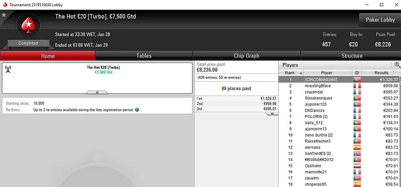 Pedro "PedroHM" Henrique foi o melhor luso com um terceiro lugar e prémio de €8.403. "RuiGamarra" foi 4º para €5.743, "pinoquio7" terminou no 6º lugar para €2.683 e Alfredo "fredovsc" Sousa foi eliminado na 8ª posição com direito a €1.253.