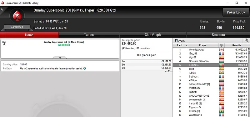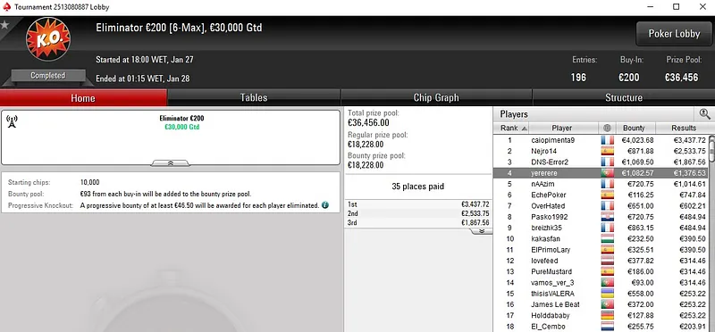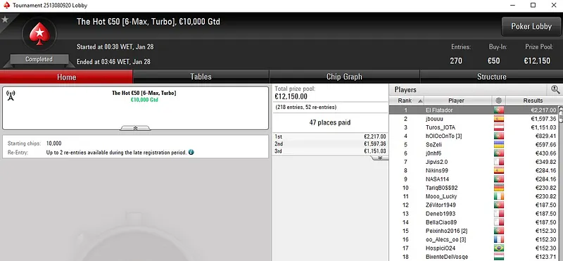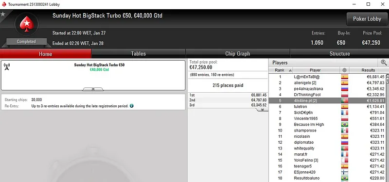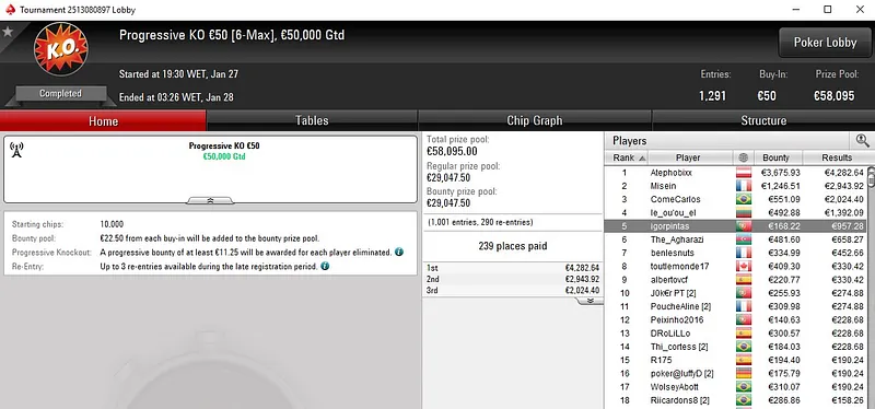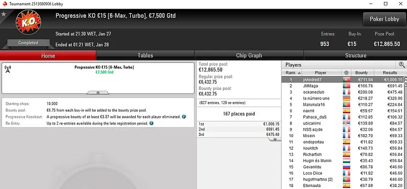 No Progressive KO €50, Tiago "tiagoferreir" Ferreira só não superou um dos adversários que teve pela frente. O português ficou com a medalha de prata e viu mais de sete horas de grind serem recompensadas com um prémio de €2.493.