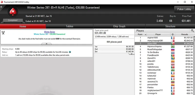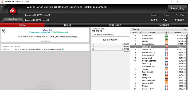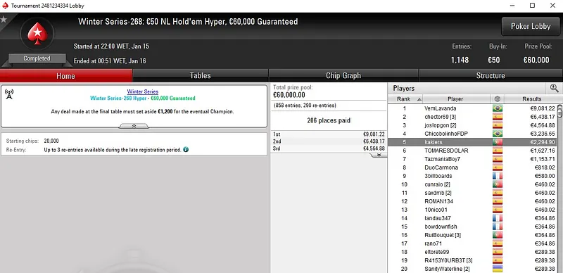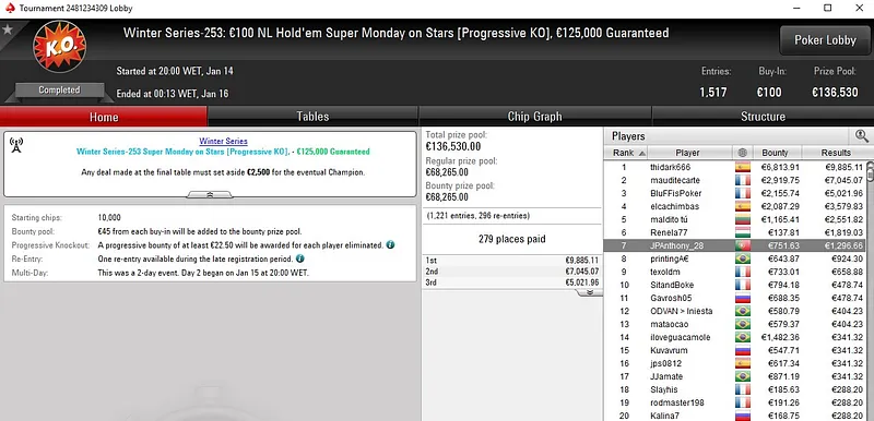 No Evento #264: €50 NLHE [Ultra KO, 6-Max] Portugal ficou muito perto do título, com Jimmy "nicoji83" Nicola a terminar no segundo lugar do pódio neste torneio que contou com 1.207 entradas. Jimmy foi recompensado com um prémio total de €4.153.