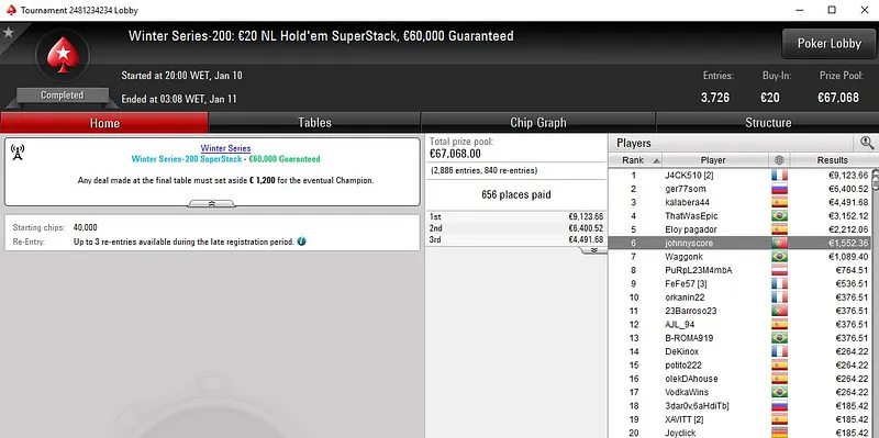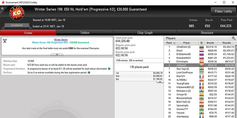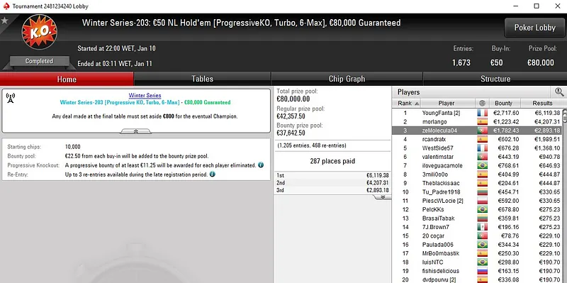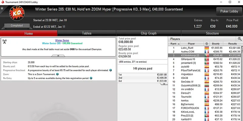 O maior prémio da sessão foi conquistado por "xaneta7" no Evento #198: €100 NLH Bubble Rush. O luso foi segundo entre um field de 693 entradas e, após acordo, garantiu um prémio de €8.957.