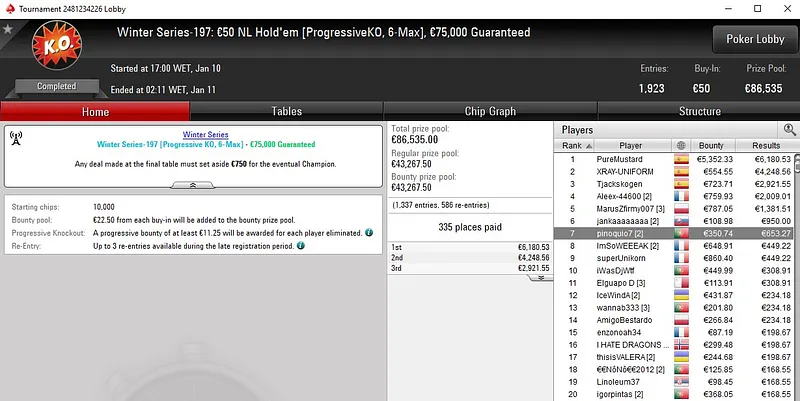 O título veio no Evento #195: €30 NLH [Deep], torneio que registou 1.751 entradas, e foi disputado entre dois portugueses. Após acordo, "rugui93" sagrou-se campeão para €6.214 e "mariveigui" recebeu €5.392 pelo segundo lugar.