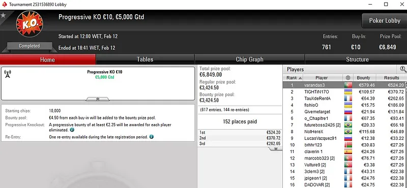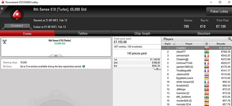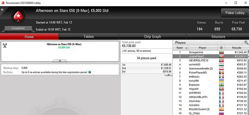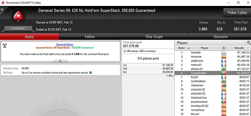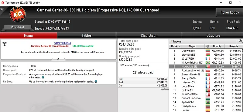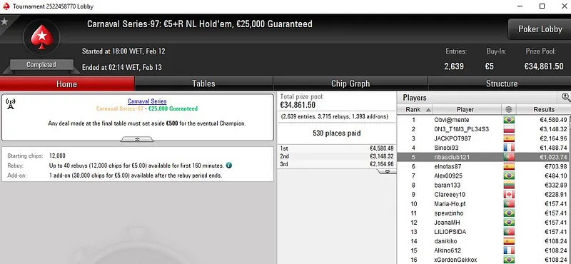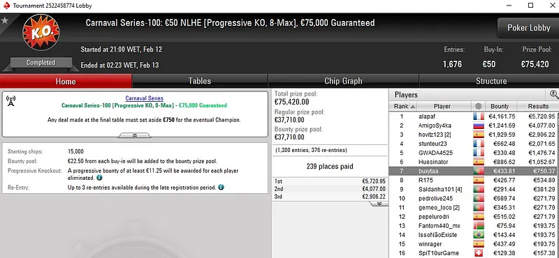 No Carnaval Series-98: €50 NLH, torneio que registou 1.461 entradas com mais de €65k em prémios, joypoker125 teve um belo desempenho e engordou a banca com um prémio de €4.720 ao terminar no 3º lugar.