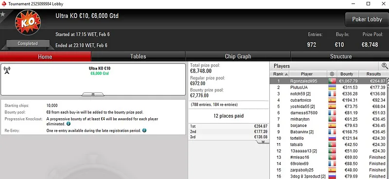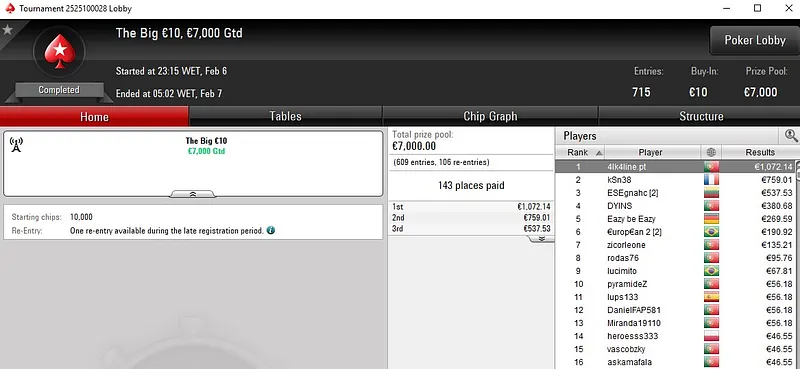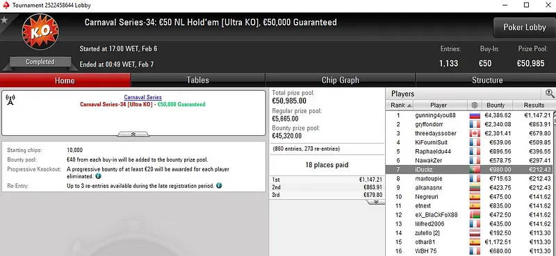 Já AFerr02 assegurou o ouro no último evento do dia, o Carnaval Series-41: €30 NLH ZOOM Hyper [PKO, 3-Max] que contou com 817 entradas. Em pouco mais de duas horas e meia de jogo, AFerr02 transformou €30 num prémio total de €3.194.