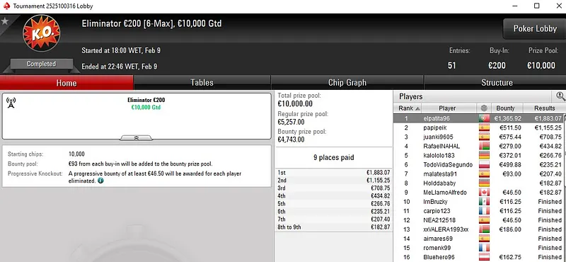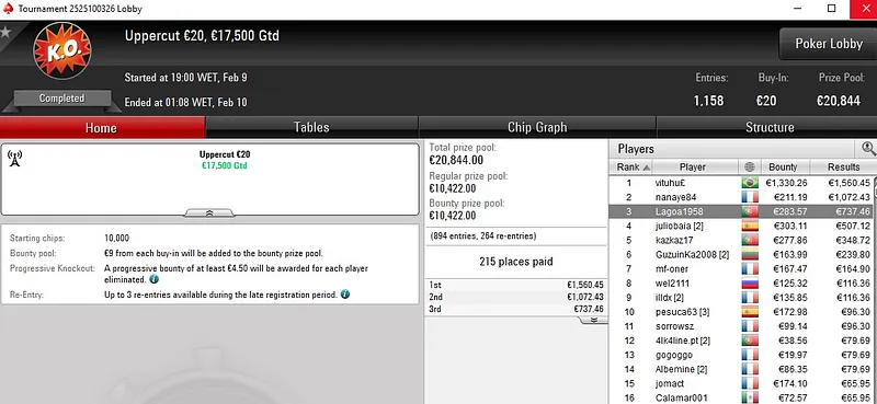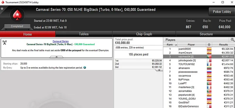 No Turbo Series-66: €20 NLHE [Deep], torneio que registou 2.342 entradas e mais de €42k em prémios, tivemos dois portugueses no Top 4. Elpatito55 levou a medalha de bronze e um prémio de €2.932 e Vítor "automuckaces" Faria terminou no 4º lugar para €2.057.