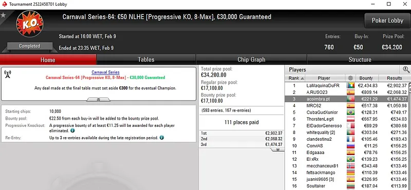 Ontem realizaram-se mais nove eventos das Carnaval Series da PokerStars e para Portugal vieram cinco prémios de quatro dígitos. O maior deles foi parar à conta de 8Nestum8, depois deste vencer o Carnaval Series-68: €20 NLH SuperStack.