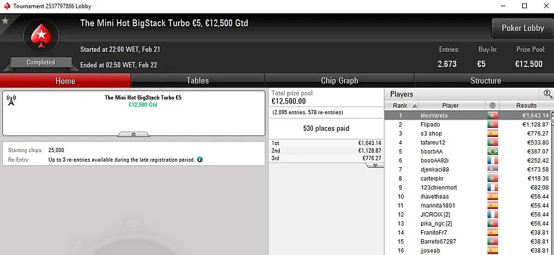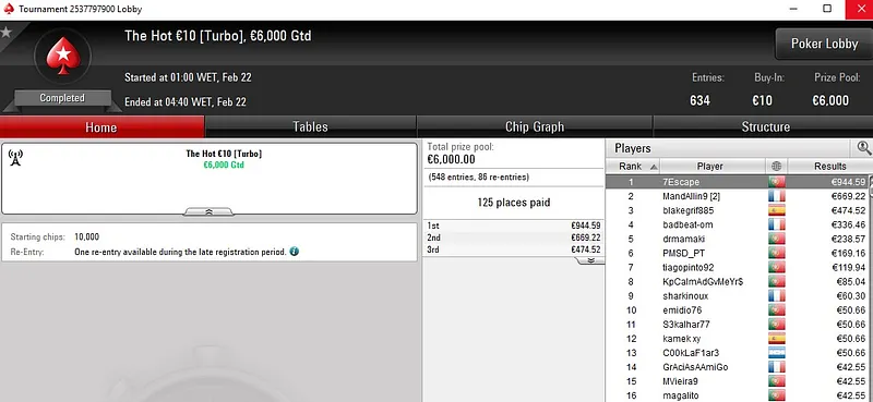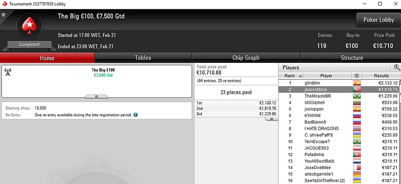 A fechar os destaques do dia temos frazoa1996. O português foi o melhor no Ultra KO €20 e garantiu um prémio total de €2.134 depois de despachar um field de 569 entradas em cerca de quatro horas de jogo.