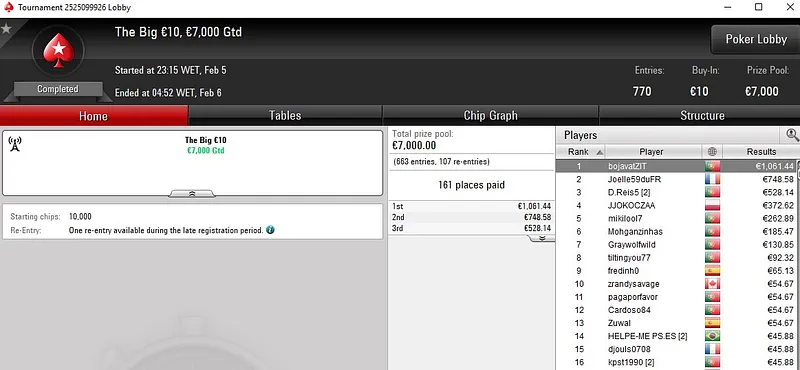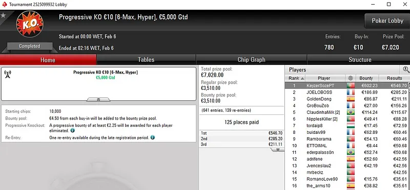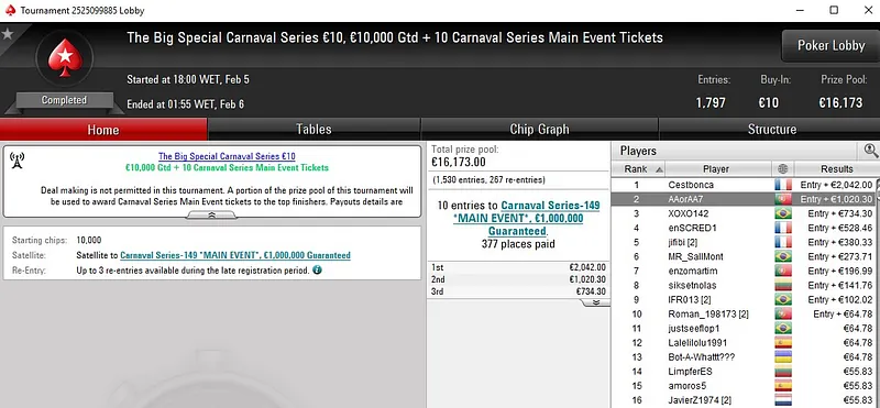 Quem também teve um dia em grande foi killergod21, com duas mesas finais e quase €11.000 em prémios. Primeiro, o português terminou no 2º lugar do Carnaval Series-16: €100 NLH [PKO] para um prémio total de €8.647. Pouco depois, fez mesa final do Carnaval Series-22: €30 NLH [Deep] e encaixou mais €2.315 pelo quarto lugar.