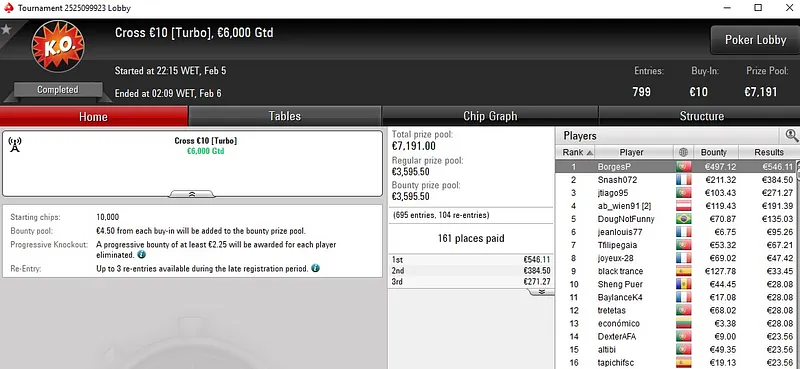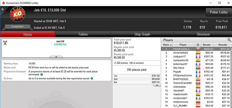 A sessão de terça-feira nas mesas da PokerStars trouxe duas vitórias e grandes prémios para os portugueses nas Carnaval Series. campbg ganhou o maior prémio do dia com o título que conquistou no Carnaval Series-24: €50 NLH [PKO, 6-Max]. O português bateu um field de 1.504 entradas e viu o seu desempenho recompensado com um prémio total de €10.057.