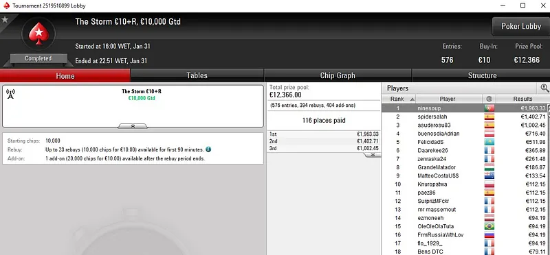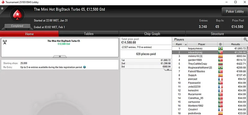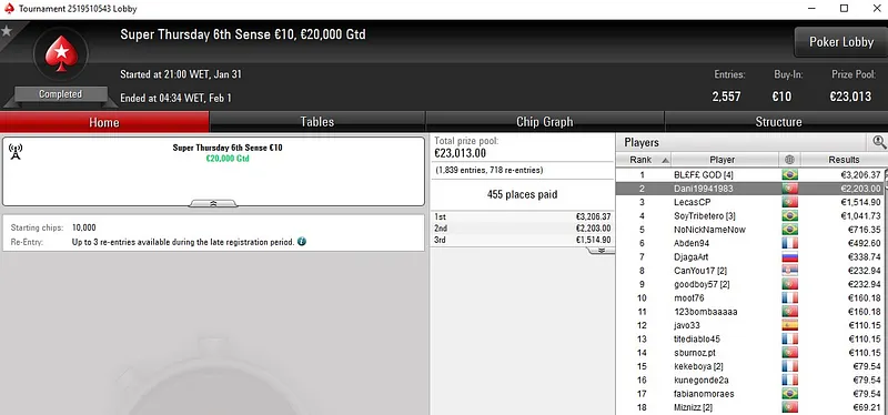 O último destaque do dia ficou reservado para Pápanela, jogador que também garantiu um prémio de quatro dígitos no Super Thursday Hot BigStack Turbo €50. O luso só não superou um dos adversários entre um field de 603 entradas e encaixou um prémio de €2.502 ao terminar no segundo lugar.