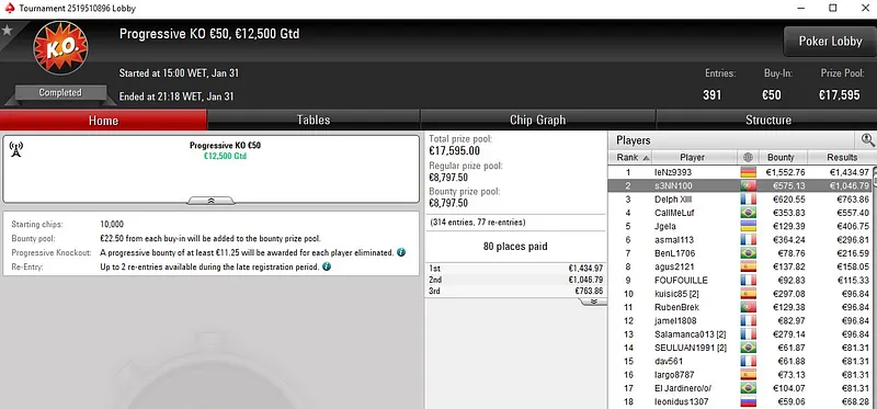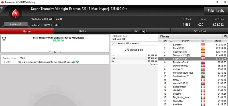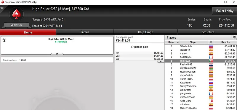 Freds top foi o maior vencedor na sessão de quinta-feira da PokerStars. O português teve um excelente desempenho no Super Thursday Night on Stars PKO €250 e garantiu um prémio de €6.814 (incluindo bounties) ao terminar no terceiro lugar do pódio. O torneio teve 338 entradas e distribuiu mais de €78K em prémios.