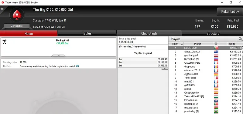 Quem também não se pode queixar da sessão de ontem é VirtúFortuna. O português bateu toda a concorrência no The Big €50, torneio que registou 555 entradas, e engordou a banca com um belo prémio de €3.964.