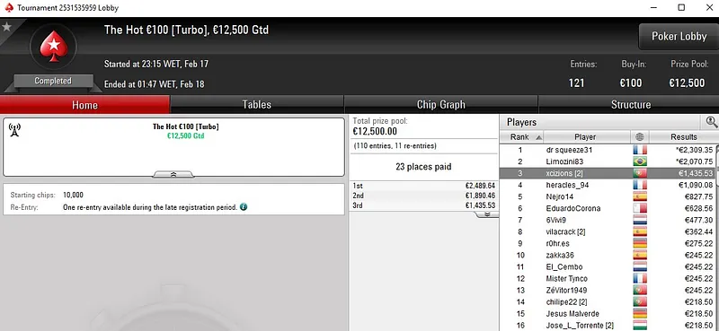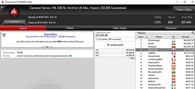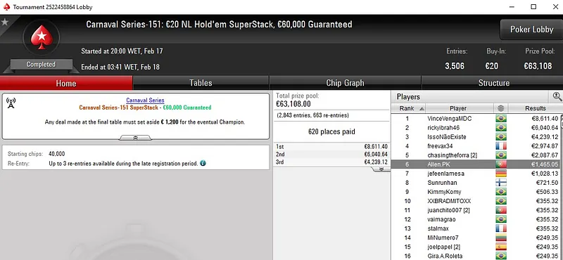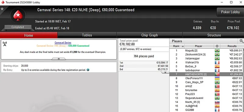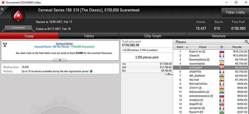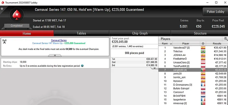 Nos eventos das Carnaval Series, o melhor resultado foi conquistado por gunswro no Evento #153: €50 NLHE BigStack [Turbo, 6-Max]. O jogador luso foi o melhor entre um field de 2.733 e transformou um buy-in de €50 num prémio de €17.052 em menos de cinco horas de jogo.