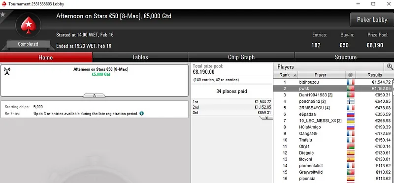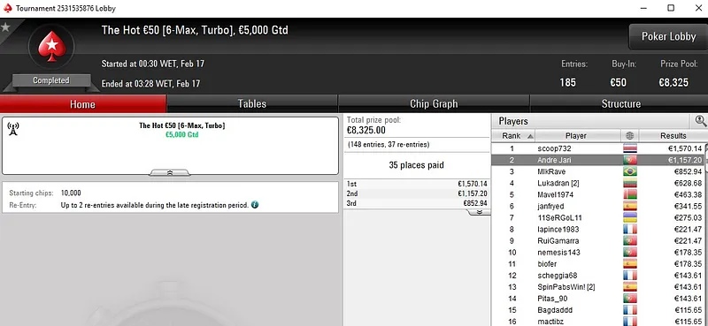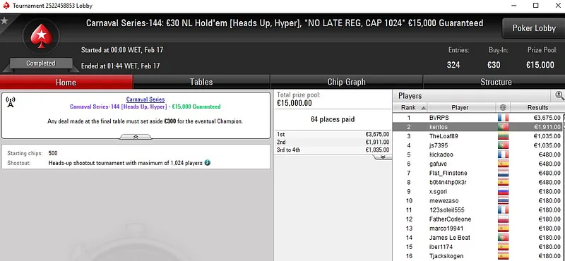 Muito perto do título ficou mavs2011bs, runner-up no Carnaval Series-136: €50 NLH [Progressive KO, 6-Max]. Este evento registou 752 entradas, distribuiu quase €34k em prémios e o jogador luso encaixou um prémio total de €3.427 ao terminar no segundo lugar.