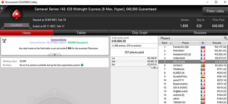 No Carnaval Series-140: €20 NLH SuperStack, torneio que contou com 1.977 entradas e €40K em prémios, o português pagaporfavor bateu toda a concorrência e subiu ao lugar mais alto do pódio para reclamar a medalha de ouro e um prémio de €5.722.