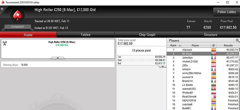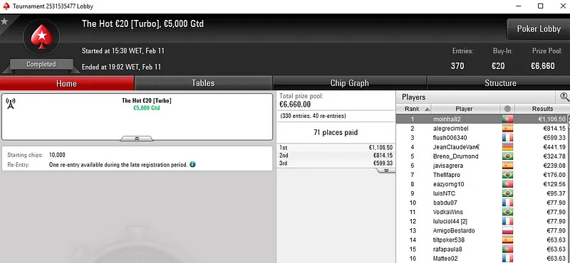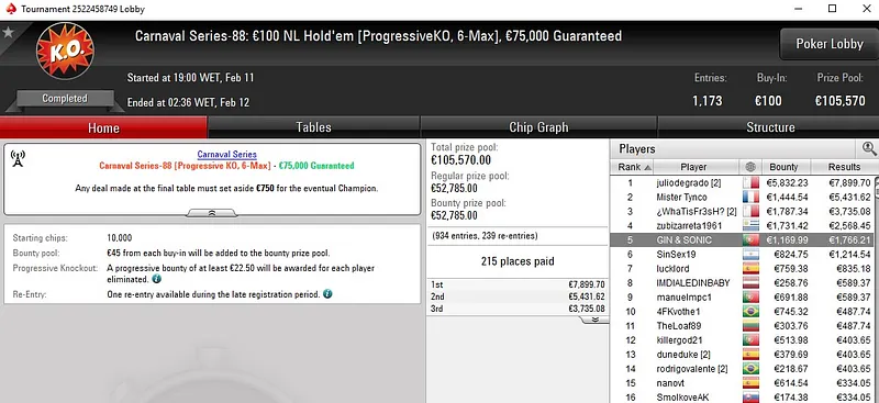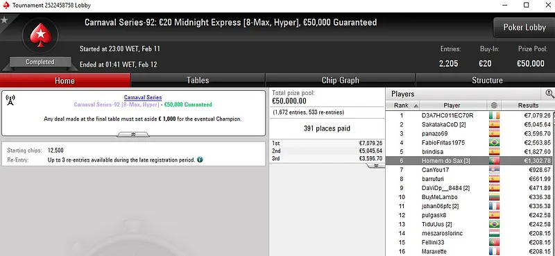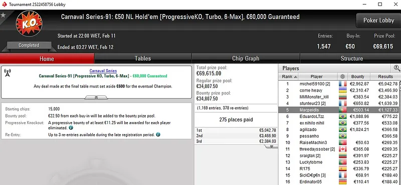 No Carnaval Series-85: €50 NLHE [PKO, 8-Max], torneio que contou com 1.284 entradas e quase €58k em prémios, tivemos JoanaFilipaT no segundo lugar do pódio com direito a €6.041. Além deste resultado, JoanaFilipaT encaixou ainda €1.055 com um runner-up no The Hot €100.