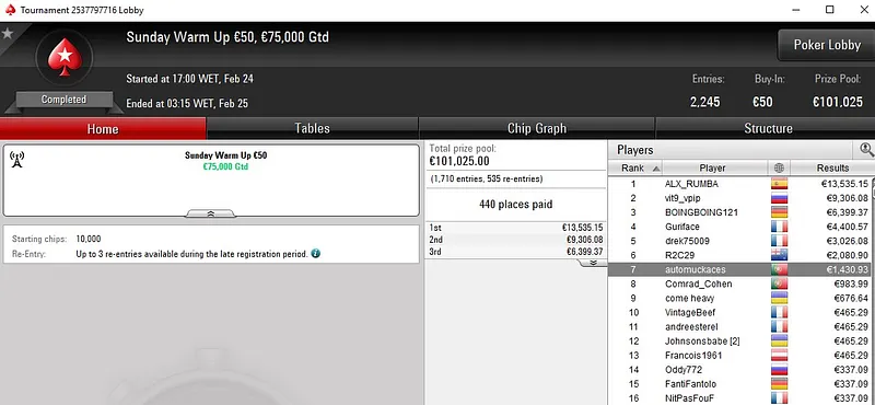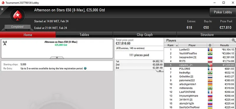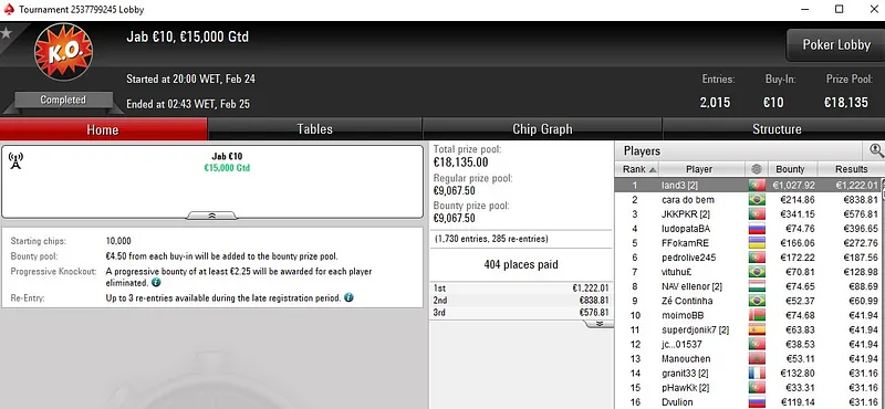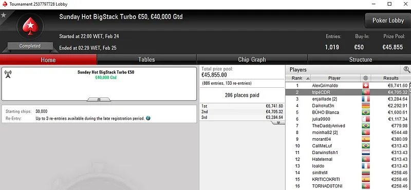 O português OSenhorPedro só não bateu um dos adversários que teve pela frente, terminou no segundo lugar e engordou a banca com um prémio de €8.799. Também na mesa final estiveram passosslb (5º para €2.861) e ajcrg1972 (7º para €1.352).
