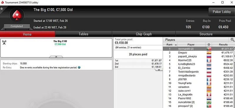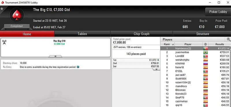 A fechar os destaques temos outra vitória, desta vez de xcizions. O jogador luso bateu toda a concorrência num field de 405 entradas e garantiu os €3.082 que estavam reservados para o campeão do The Hot BigStack Turbo €50.
