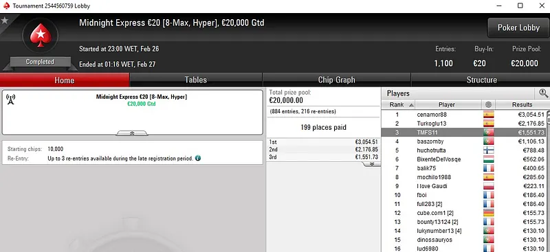 A sessão de terça-feira nas mesas da PokerStars.pt trouxe vários prémios de quatro dígitos para Portugal. Scratchh22 subiu ao lugar mais alto do pódio no Uppercut €20 e garantiu o maior prémio do dia. Este torneio contou com 1.596 entradas, quase €28K em prémios e jogador português engordou a banca com um prémio total de €3.412.