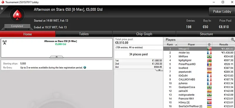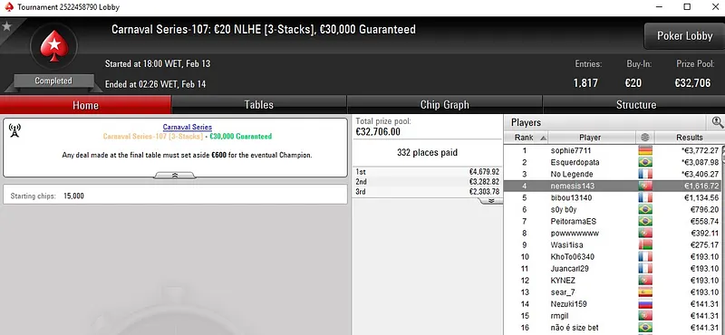 A quarta-feira de grind foi calma em termos de resultados portugueses, mas ainda assim houve quem encaixasse bons prémios nas Carnaval Series da PokerStars. Um desses casos foi Tutti4Simons, que não só venceu o Carnaval Series-111: €50 NLH [PKO, Turbo, 6-Max] como também garantiu o maior prémio do dia.
