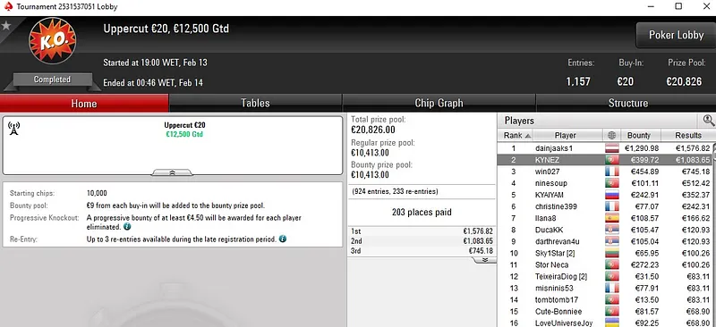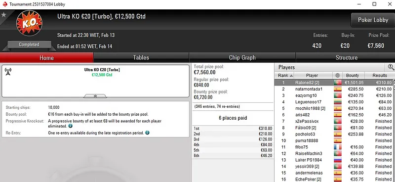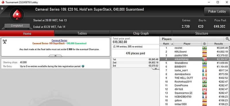 Já kkapini ficou muito perto da vitória no Carnaval Series-110: €30 NLH [Deep, Turbo]. O jogador português só não conseguiu ultrapassar o último adversário que teve pela frente, entre um field de 1.411 entradas, e recebeu um prémio de €3.898 pelo segundo lugar.
