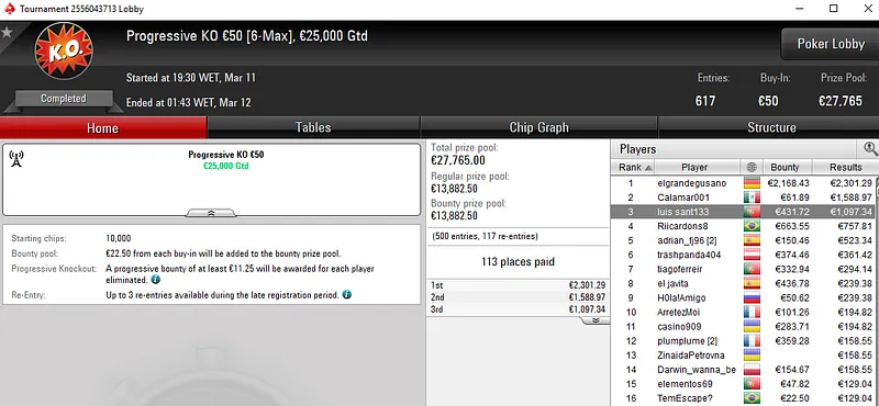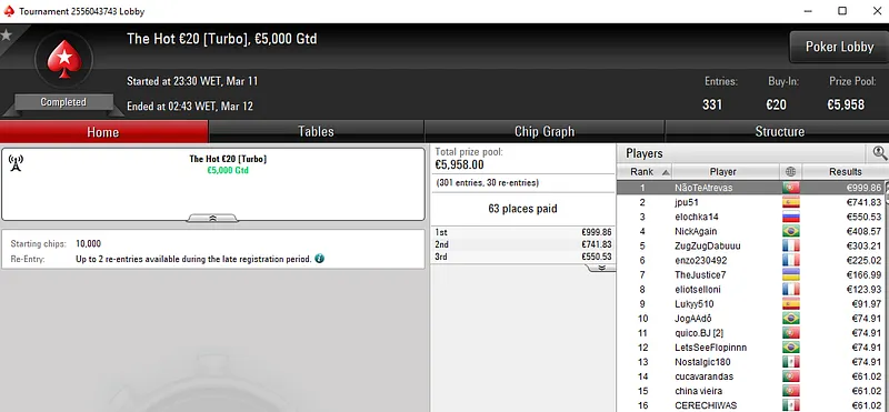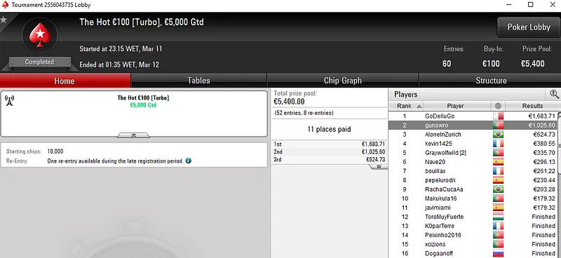 Este torneio registou 56 entradas e contou com dois lusos no pódio. GeneraPatton levou a medalha de prata e um prémio de €2.730 e o seu compatriota NouLemitSueca recebeu os €1.598 que estavam reservados para o terceiro classificado.