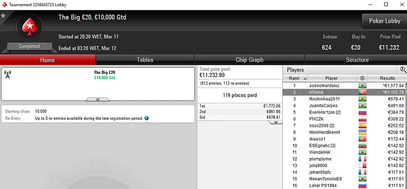 Quem também faturou um prémio de quatro dígitos foi sopegada08. O português foi segundo, entre um field de 478 entradas, no Super Monday Hot BigStack Turbo e transformou um buy-in de €50 num prémio de €2.485 em menos de quatro horas de jogo.