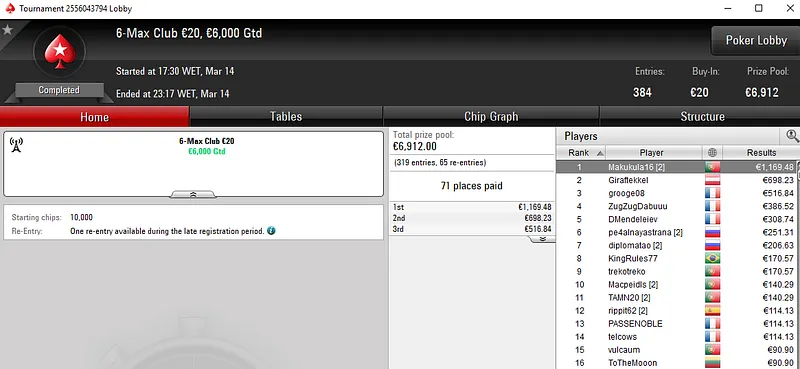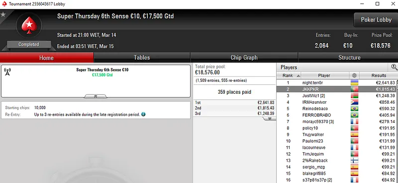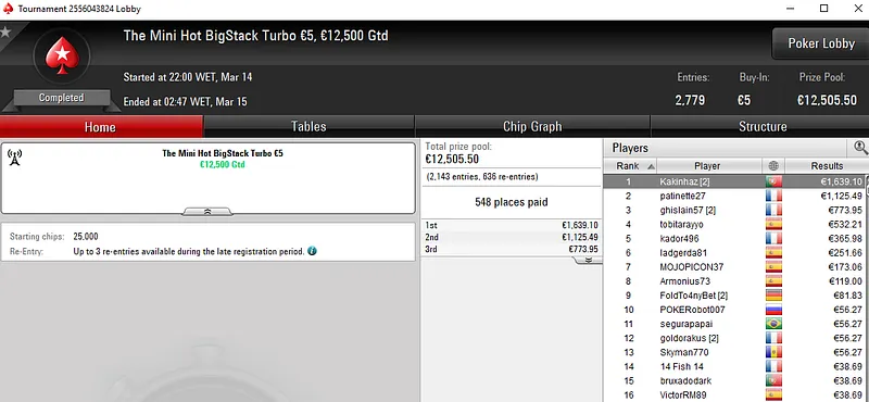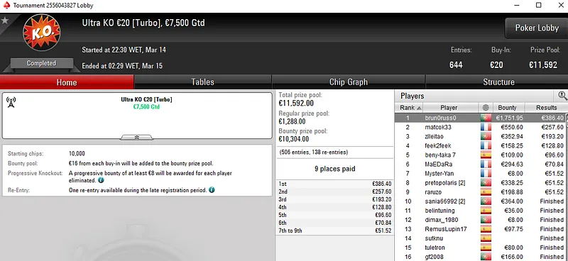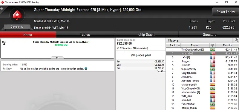Pedro abriu a sessão com uma vitória no The Big €100 da tarde para €1.862. Depois, venceu também a edição da noite do mesmo torneio e encaixou mais €1.504. E para fechar a sessão, subiu ao terceiro lugar do pódio The Hot €50 para mais €787.