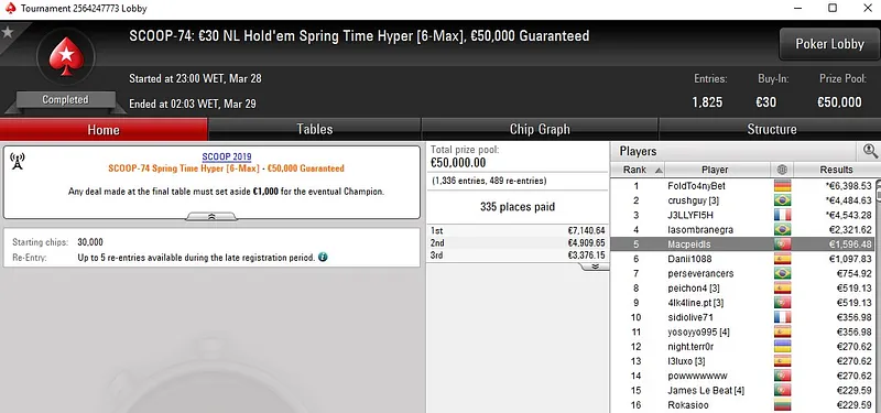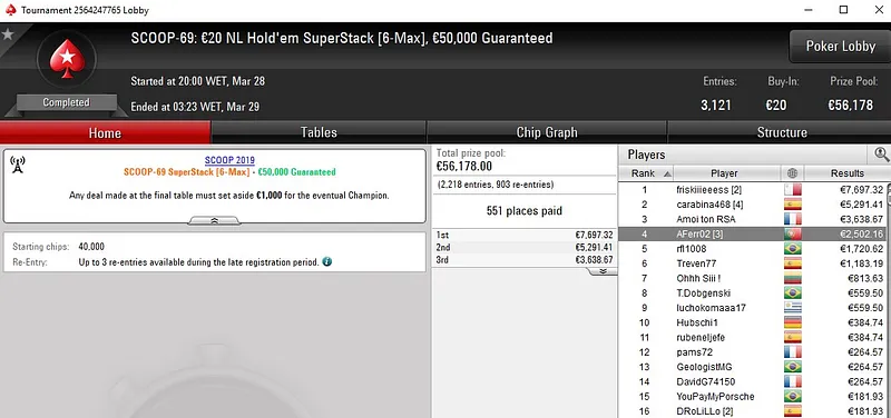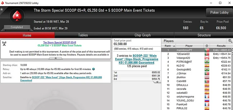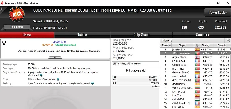 Já o jogador dono da conta ANDYYS, foi o único português a garantir um título SCOOP na sessão de ontem. Ele bateu toda a concorrência no SCOOP-62: €5 NLH [6-Max] e subiu ao lugar mais alto do pódio para receber €1.526, prémio resultante de um acordo entre os três finalistas.