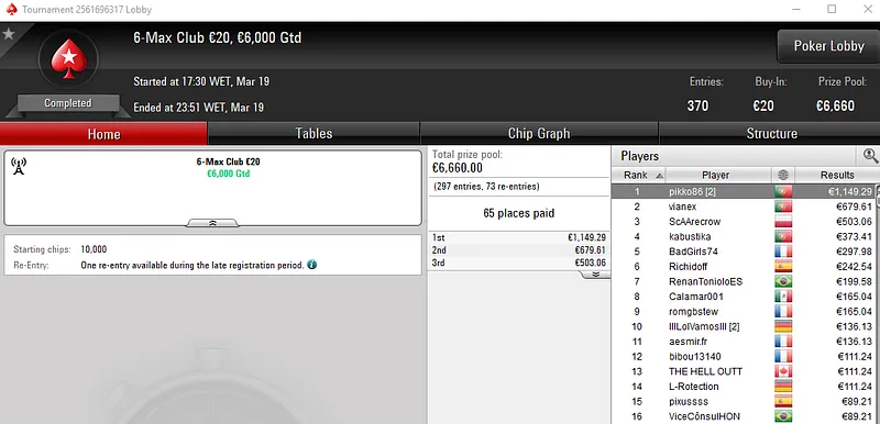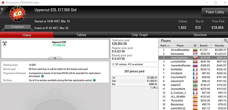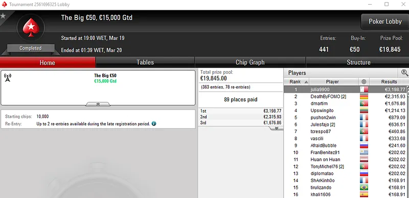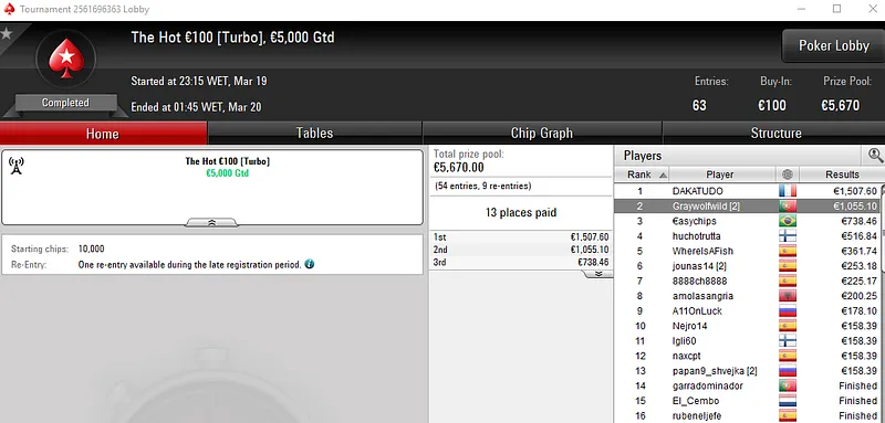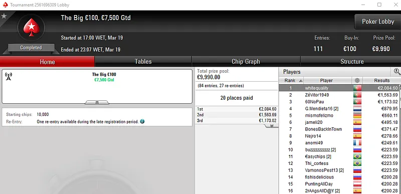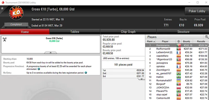 Quem também faturou um bom prémio de quatro dígitos foi João "joaobarb" Barbosa. O craque português foi segundo classificado entre um field de 348 entradas no Night on Stars €100 [8-Max] e engordou a banca com um prémio de €4.054.