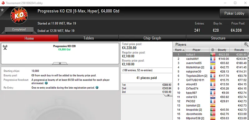 O maior prémio da sessão de ontem veio pelas mãos de 123bombaaaaa. O luso bateu toda a concorrência no Progressive KO €50 [6-Max] e subiu ao lugar mais alto do pódio para receber um prémio total de €4.392. O torneio contou com 533 entradas e distribuiu quase €24K em prémios.