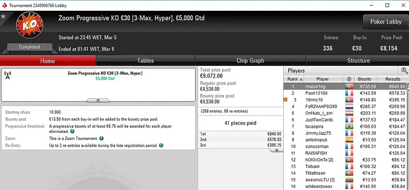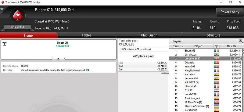 A sessão de terça-feira trouxe mais de uma dezena de prémios de quatro dígitos para os jogadores portugueses nas mesas da PokerStars.pt. O maior prémio do dia voltou a ser conquistado num dos torneios mais rápidos, o Midnight Express €20. NoemiSL subiu ao segundo lugar do pódio e encaixou um prémio de €2.329 em menos de duas horas de jogo.