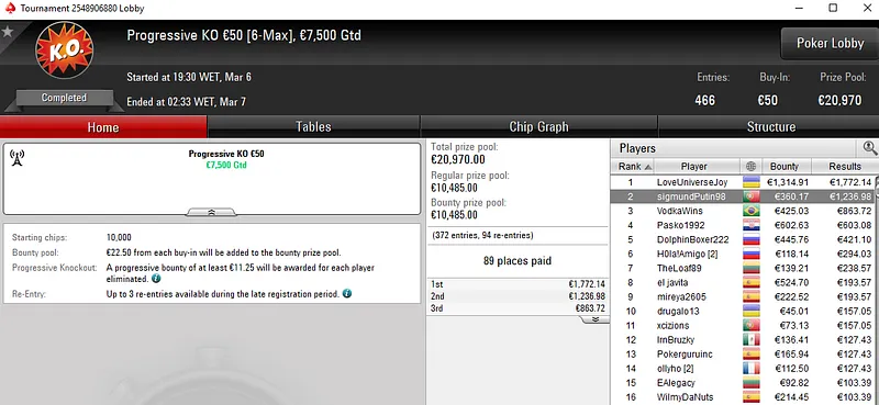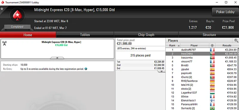 Já johnnyscore, subiu ao lugar mais alto do pódio no Bigger €10, torneio que registou 2.140 e um prize pool superior a €19.000. O português foi o melhor e faturou um prémio de €2.587 em cerca de seis horas e quarenta mitos de jogo.