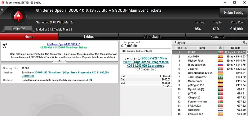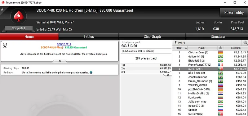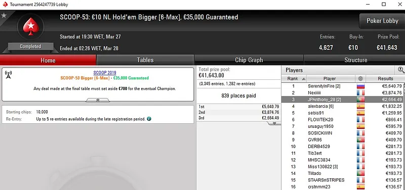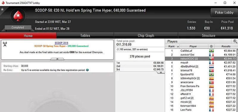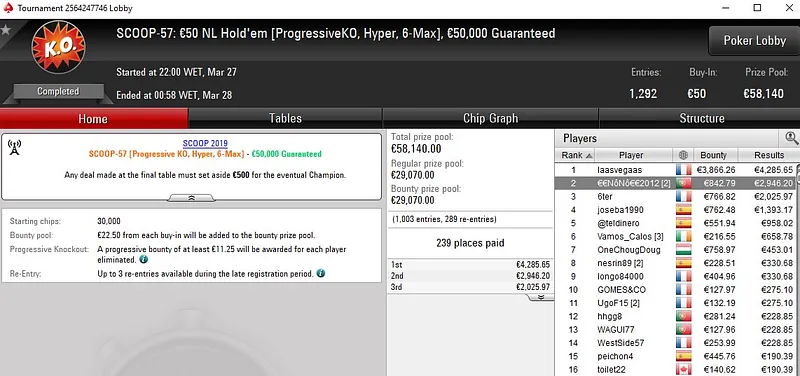 Já no SCOOP-55: €50 NLH BigStack [Turbo], tivemos dois portugueses no pódio que garantiram os maiores prémios do dia. Neste torneio que contou com 1.445 entradas e mais de €65K em prémios, kakiers ficou com a medalha de prata e um prémio de €6.653 e KeyzerSozePT encaixou €4.669 pelo terceiro lugar.