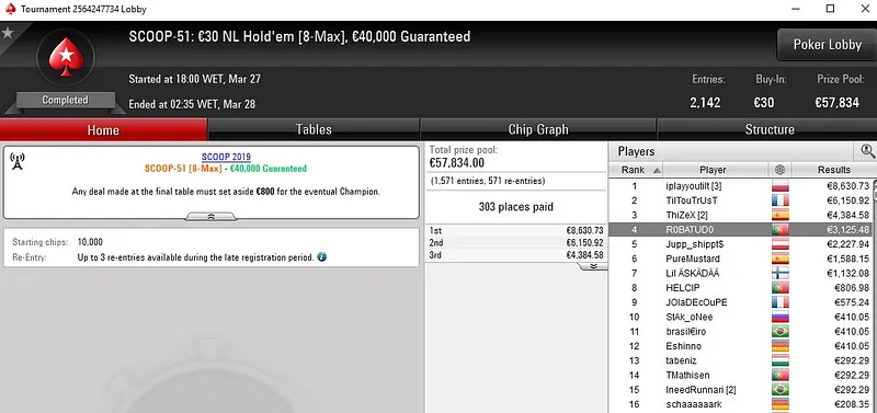 | 74 | 30 € | 23:00 | 6-Max Spring Time Hyper | 50,000 € |