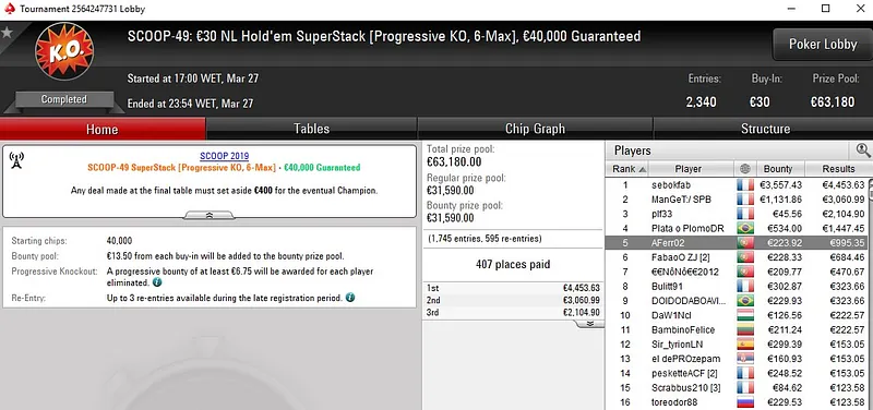 O responsável pela vitória na sessão de ontem foi SniF222, jogador que bateu um field de 2.399 entradas no SCOOP-59: €10 NLH [Progressive KO, Turbo] para engordar a banca com um prémio de €2.445. No segundo lugar do pódio ficou o seu compatriota ioan89892, com direito a €1.213.