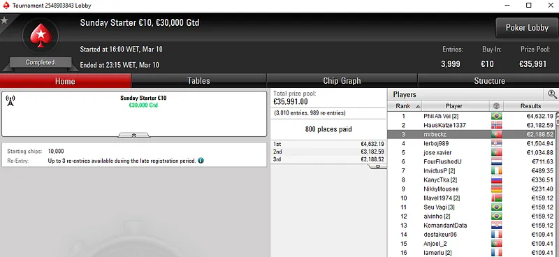 A fechar os destaques deste domingo temos outra vitória que rendeu um belo prémio de quatro dígitos. JoaoCauteloso bateu um field de 3.765 entradas no Sunday Progressive KO €20 e, após acordo no heads-up, levou o título e engordou a banca com um prémio de €6.039.