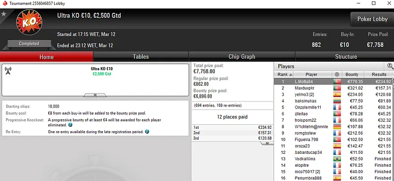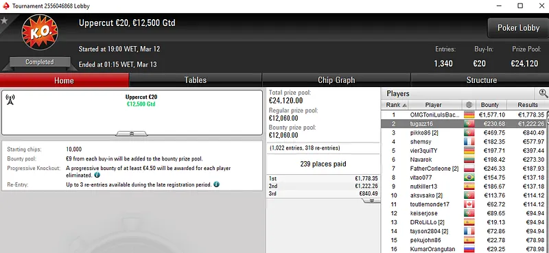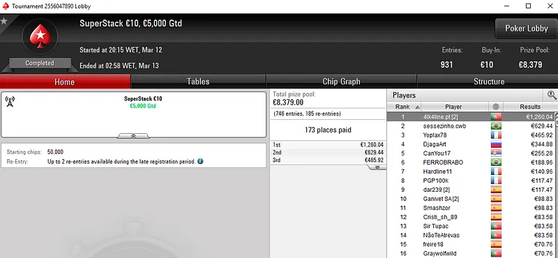 O título do The Big €10 também veio para Portugal. vramos1919 foi o melhor entre um field de 1.403 entradas e viu quase oito horas de trabalho recompensadas com um prémio de €1.570.