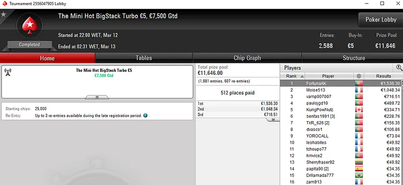 No grind de terça-feira, os portugueses somaram sete vitórias com prémios de quatro dígitos nos torneios regulares da PokerStars.pt. O grande destaque do dia foi vamos_ver_3, jogador que bateu um field de 441 entradas no The Hot BigStack Turbo €50 para subir ao lugar mais alto do pódio e receber os €3.326 que estavam reservados para o campeão.