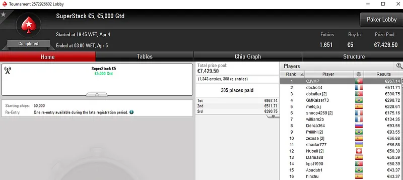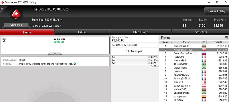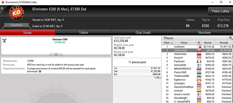 | 196 | 30 € | 23:00 | 6-Max Spring Time Hyper | 40,000 € |