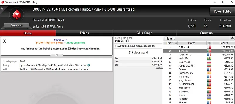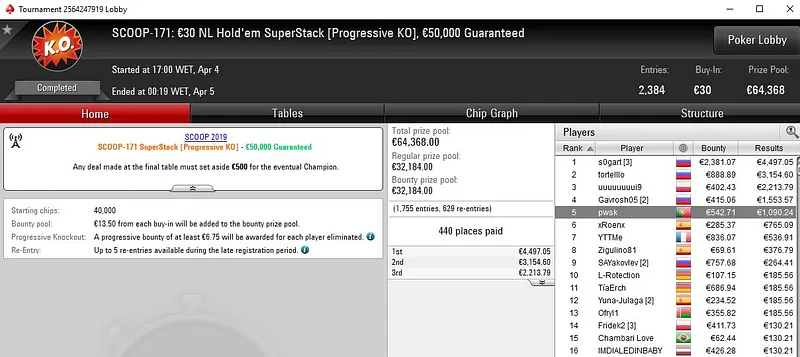 Quem mais faturou nos eventos SCOOP de ontem foi adebisi5, jogador que ficou muito perto do título no SCOOP-181: €30 NLH Spring Time Hyper [6-Max]. Este torneio contou com 1.840 entradas, distribuiu €50K em prémios e o português encaixou €4.909 ao terminar no segundo lugar do pódio.