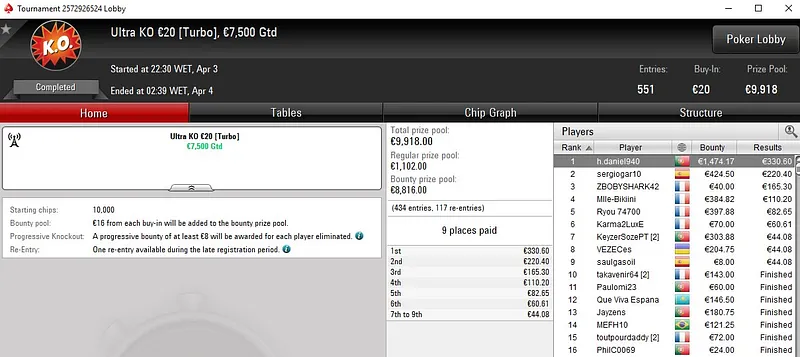 Bruno foi o melhor entre um field de 1.404 entradas e engordou a banca com um prémio total de €16.507. João "4lk4line.pt" Alçada também esteve presente na mesa final e levou €1.647 pelo sétimo lugar.