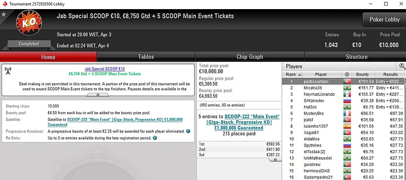 O segundo título SCOOP da sessão veio pelas mãos de Tiago "123bombaaaaa" Rafael, que despachou toda a concorrência no SCOOP-165: €30 NLH Spring Time Hyper [6-Max] em menos de três horas de jogo para encaixar €6.335. PezinhosDeLa levou a medalha de bronze e €2.994.