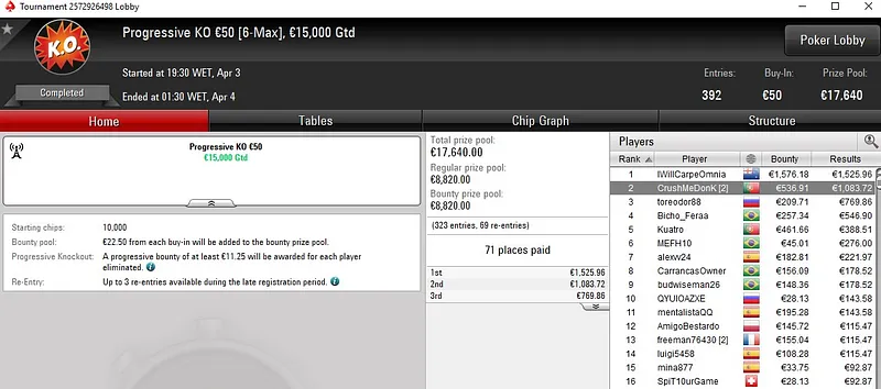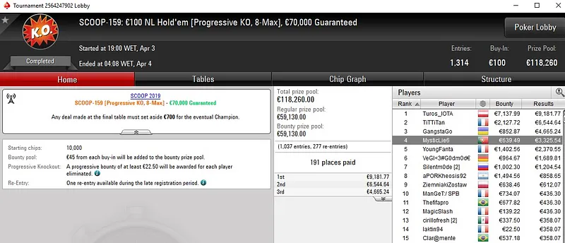 | 181 | 30 € | 23:00 | 6-Max Spring Time Hyper | 50,000 € |