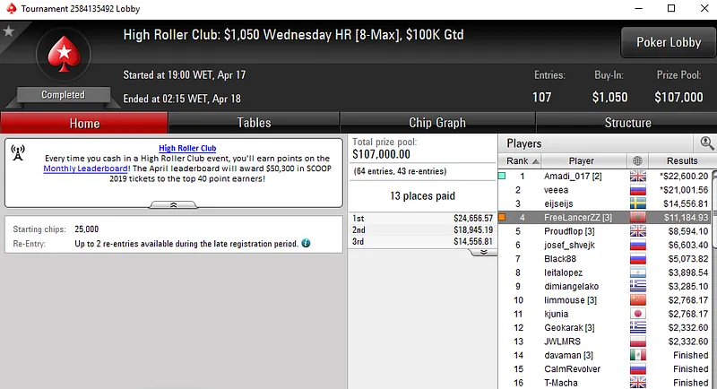 Em dia de folga para a maioria dos portugueses que jogam nas mesas internacionais, Michel "FreeLancerZZ" Dattani esteve em grande ao reservar lugar em quatro mesas finais (um delas não oficial) de seis possíveis, nos torneios High Roller Club da Pokerstars e encaixou mais de $33.000 em prémios.